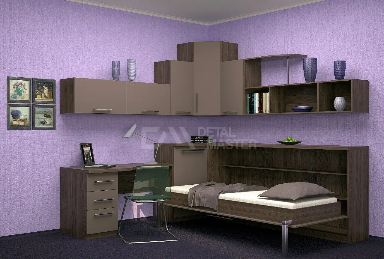 Горизонтальная шкаф-кровать со столом и верхними модулями для подростков "Teen Max ".  Шкаф-кровать работает на механизме раскладывания собственной разработки "Start". Кровать раскладывается легким движением руки, превращаясь в полноценное спальное место. Просто потяните ее за ручки, расположенные на фасаде и выставите ножки-опоры.